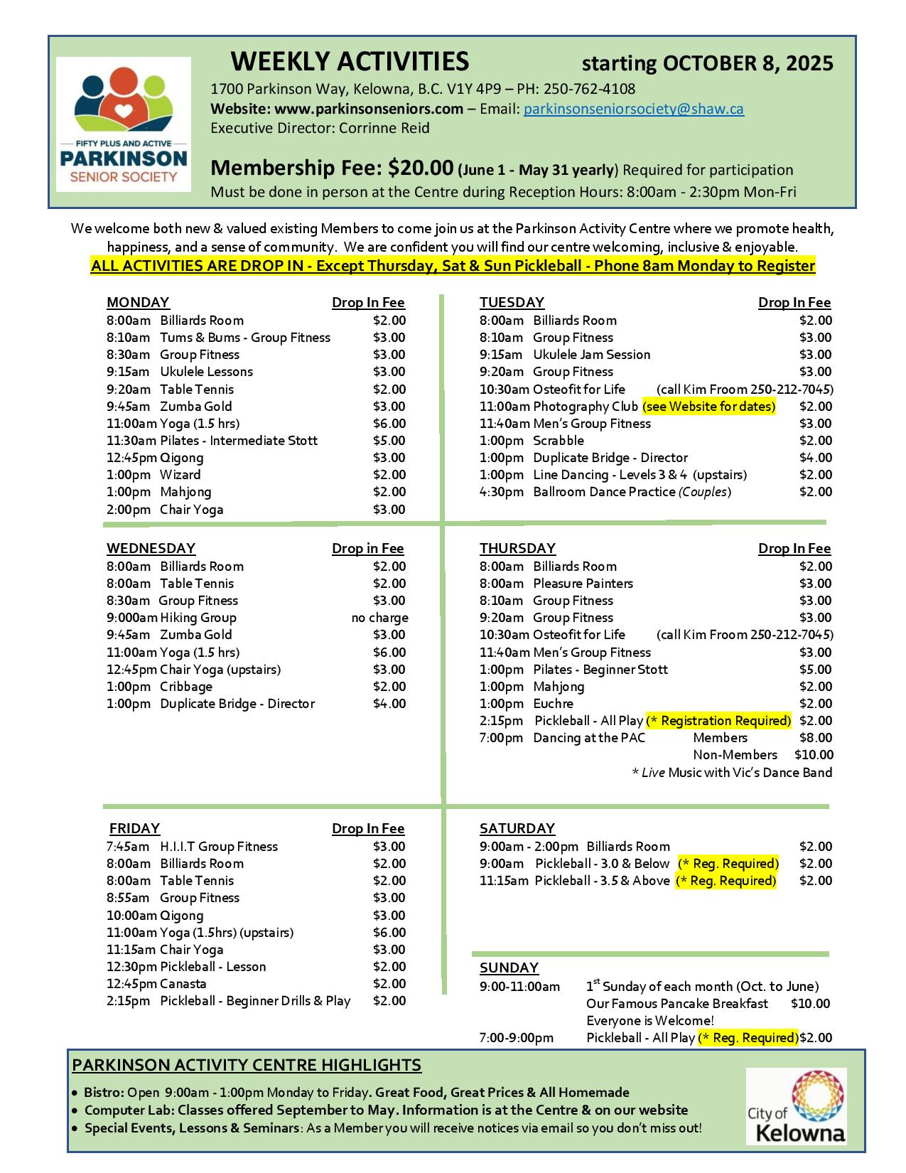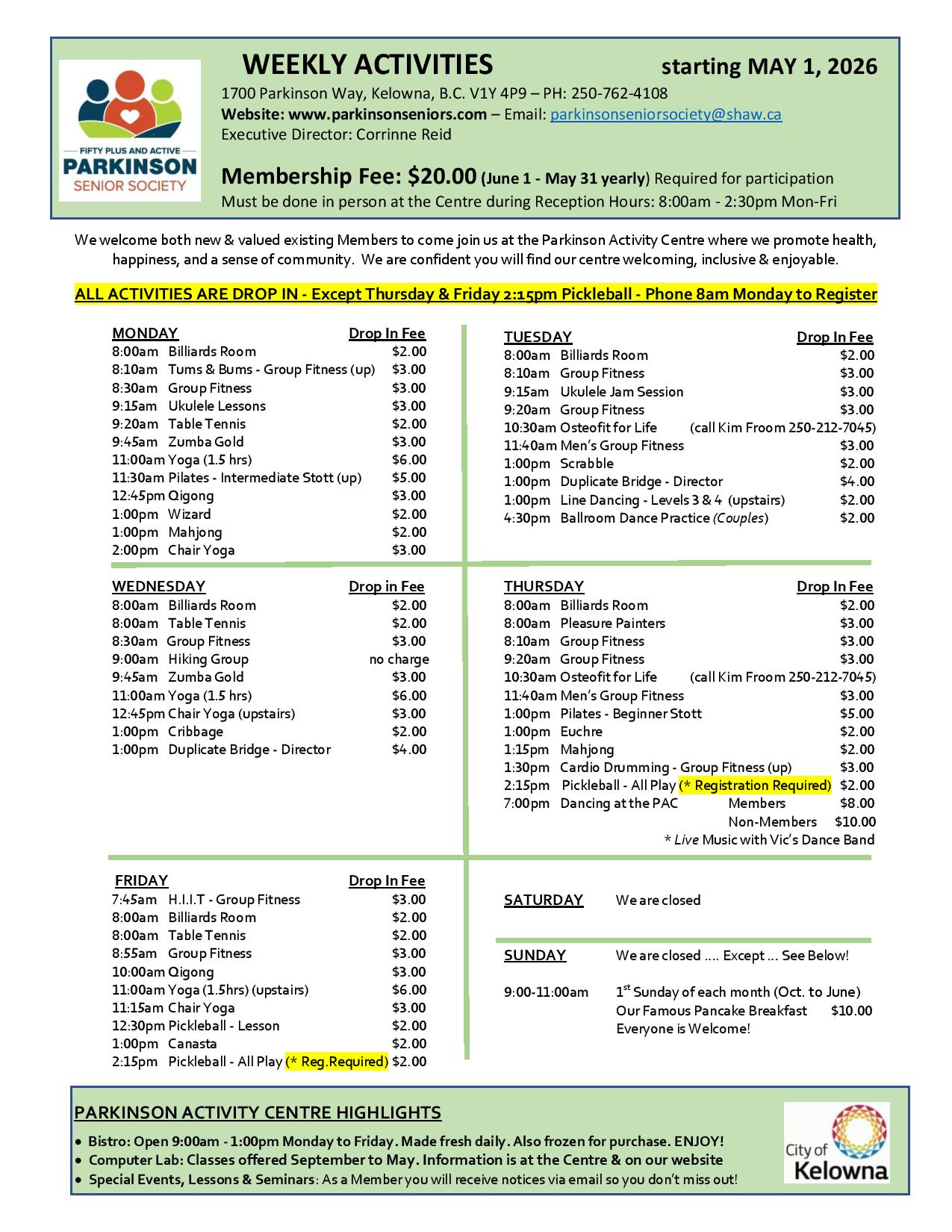 Becoming a member is simple! You will need to complete a short application form which can be done either online or at the Centre. Then come and see us at the Reception Desk in person to pay the $20.00/year membership fee and have your Membership Card issued. Once you become a member of our Association you are welcome to participate in any of our activities by just paying the nominal drop in fee that applies to each group activity. Membership runs from June 1 to May 31 annually. We look forward to your joining us!