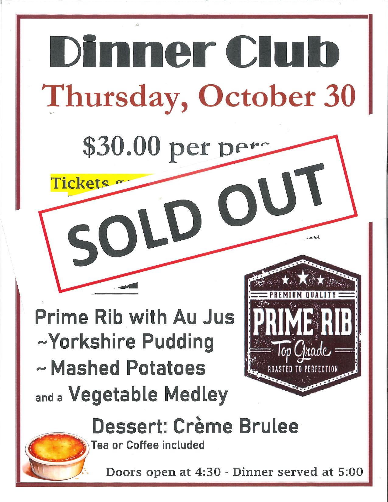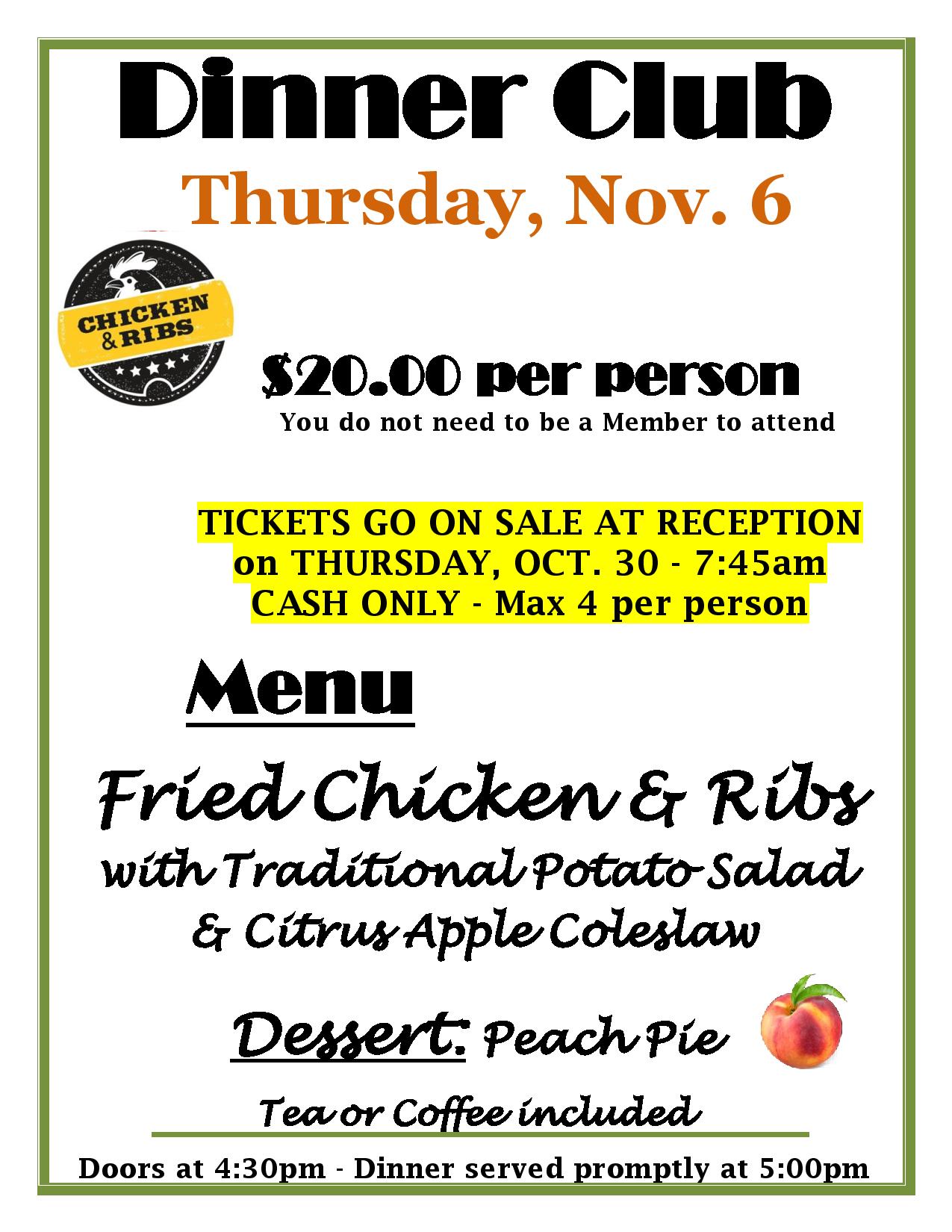 Seating is limited to 45 people so get your tickets early. You do not need to be a Member to attend. Dinner is always served at 5:00pm sharp.