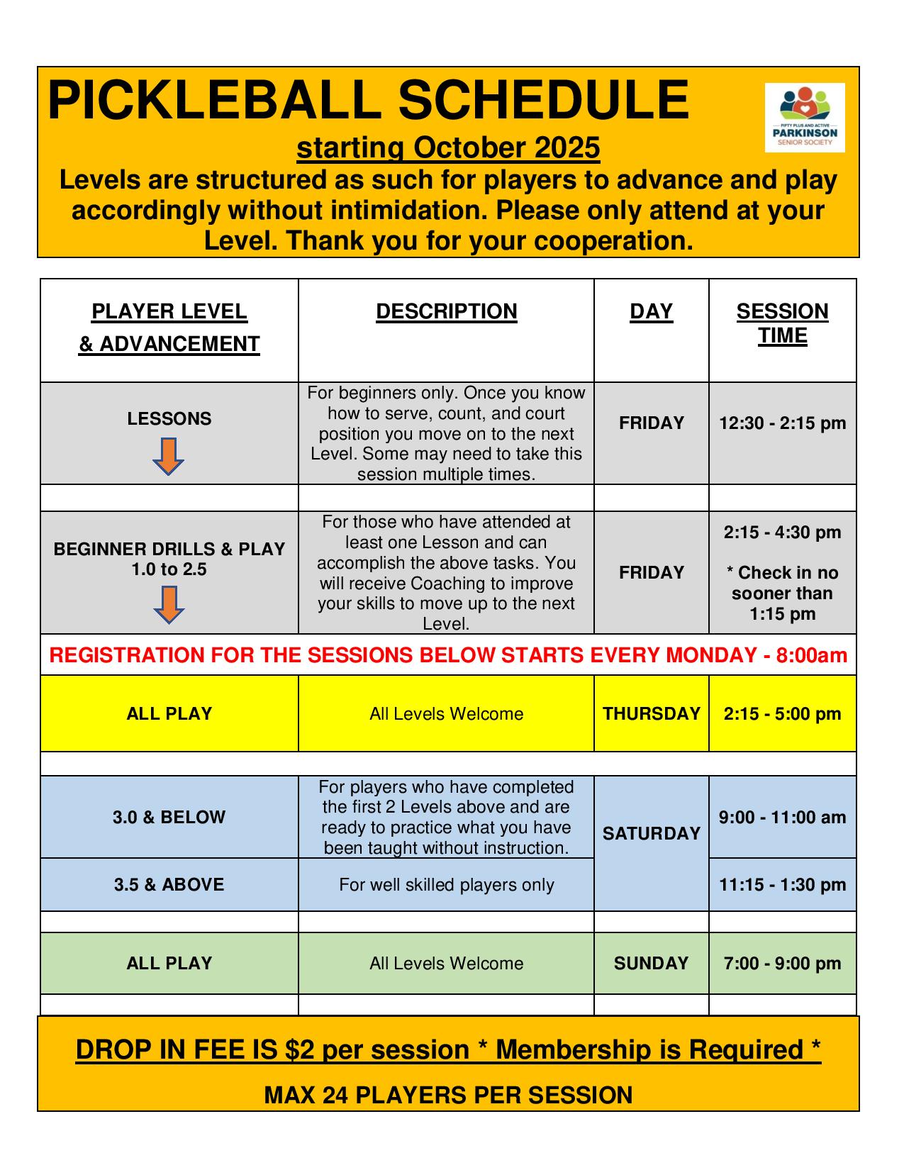 Level 3.0 + Below– This session is strictly for beginners transitioning into play. Please do not attend if you are a higher level than 3.0. Look to the schedule for the day your level is played.