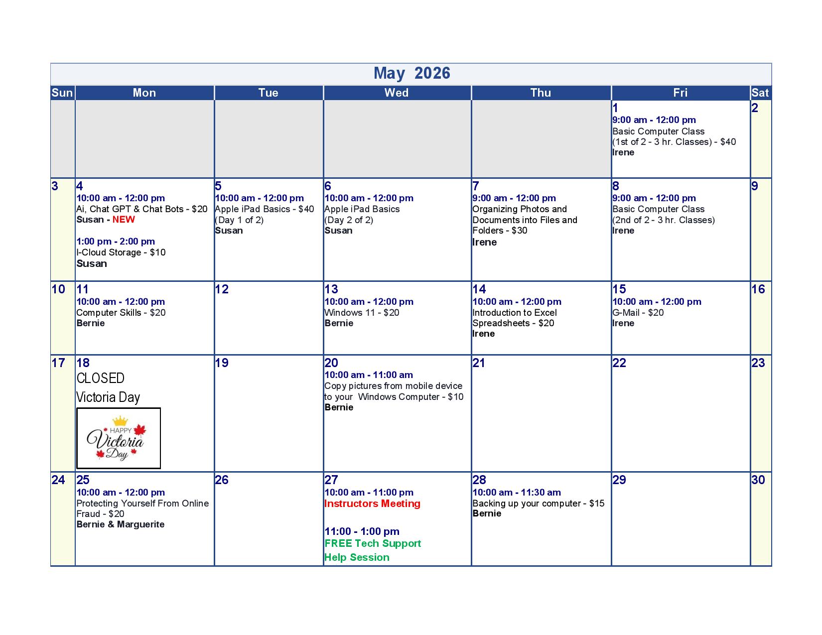 Monthly Course Calendars